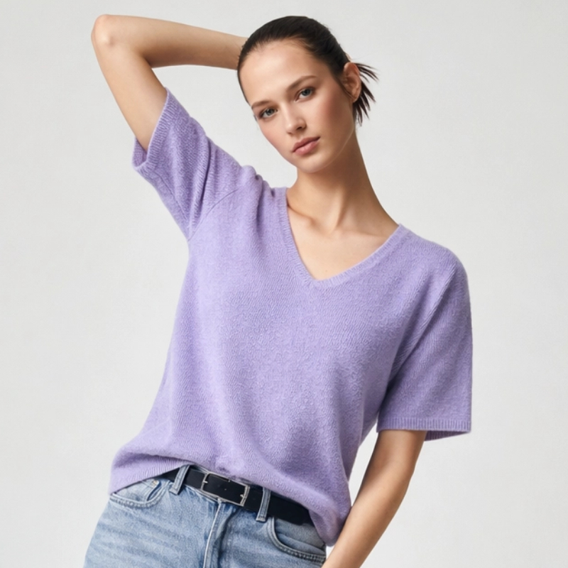 Ein zeitloses Strickshirt mit femininem V-Ausschnitt, das durch seine klare Linienführung und angenehme Haptik überzeugt. Der locker fallende, gerade Schnitt sorgt für hohen Tragekomfort, während die kurzen Ärmel dem Modell eine leichte und vielseitige Ausstrahlung verleihen. Die feine Strickqualität macht das Shirt zum idealen Begleiter für unterschiedlichste Looks – solo getragen oder kombiniert mit Jacken und Mänteln. Passform: gerade, locker fallend Details: V-Ausschnitt, kurze Ärmel, feine Strickstruktur, sauber verarbeitete Abschlüsse. Ein vielseitiges Strickshirt, das Komfort und moderne Eleganz mühelos vereint.