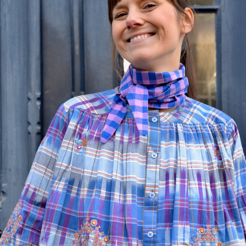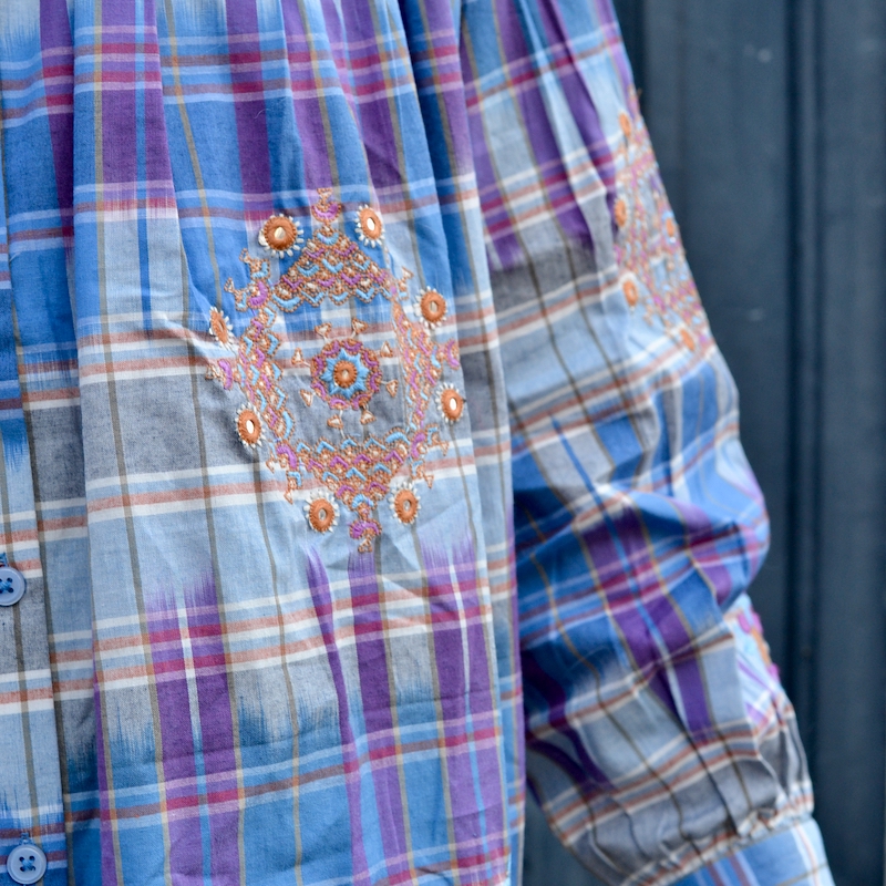 Ikat-Stoff mit Spiegelstickereien. Einheitsgröße und locker sitzende Bluse.