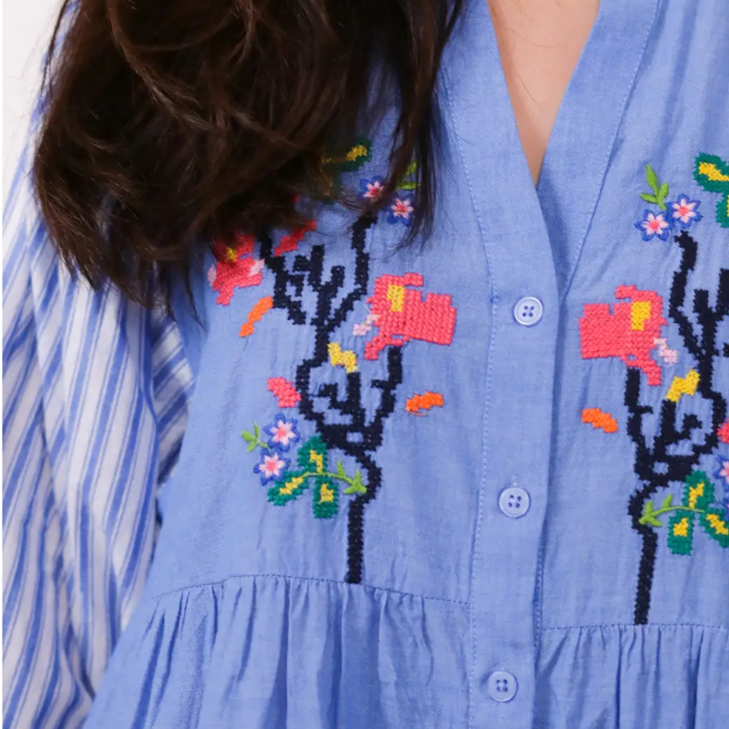 Langes Kleid mit gestreiften Ärmeln Blumenstickerei auf der Brust und am unteren Teil des Kleides.