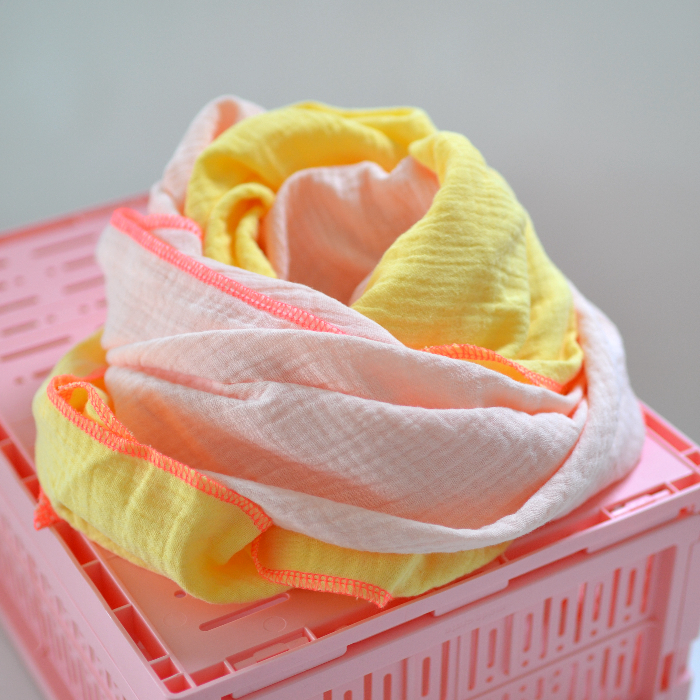 Großes dreieckiges Tuch aus Musselin in zwei Farben.