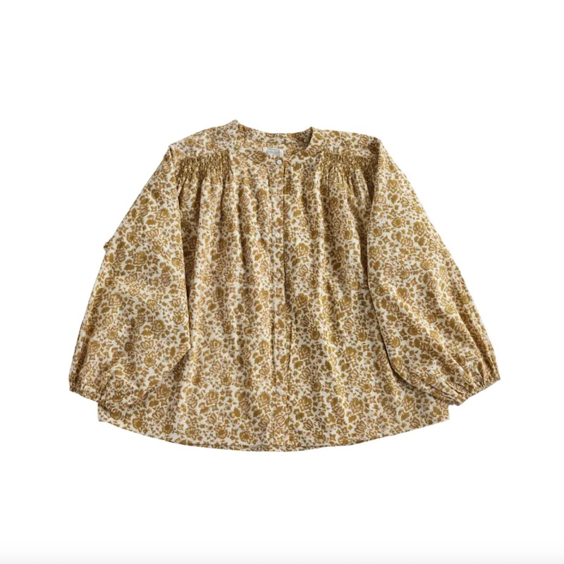 Der Schnitt mit gesmokten und gerafften Details und die locker geschnittenen Ärmel verleihen ihr einen Boho-Look.