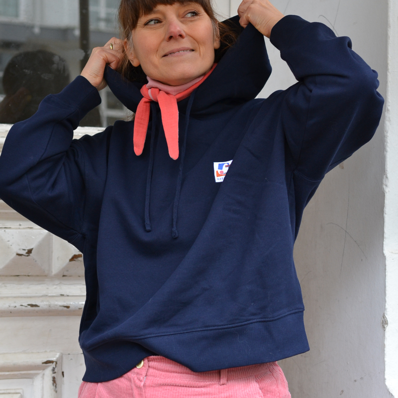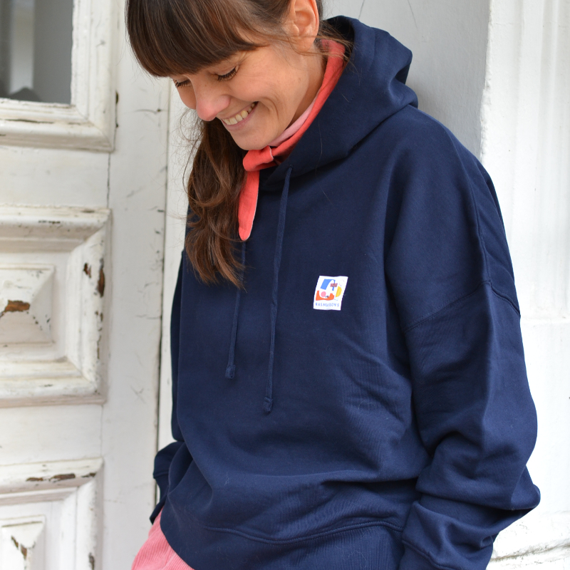 Er ist boxy und eher kurz geschnitten, hat eine doppellagige Kapuze und sitzt daher genauso gemütlich, wie es sich für einen Hoodie gehört.