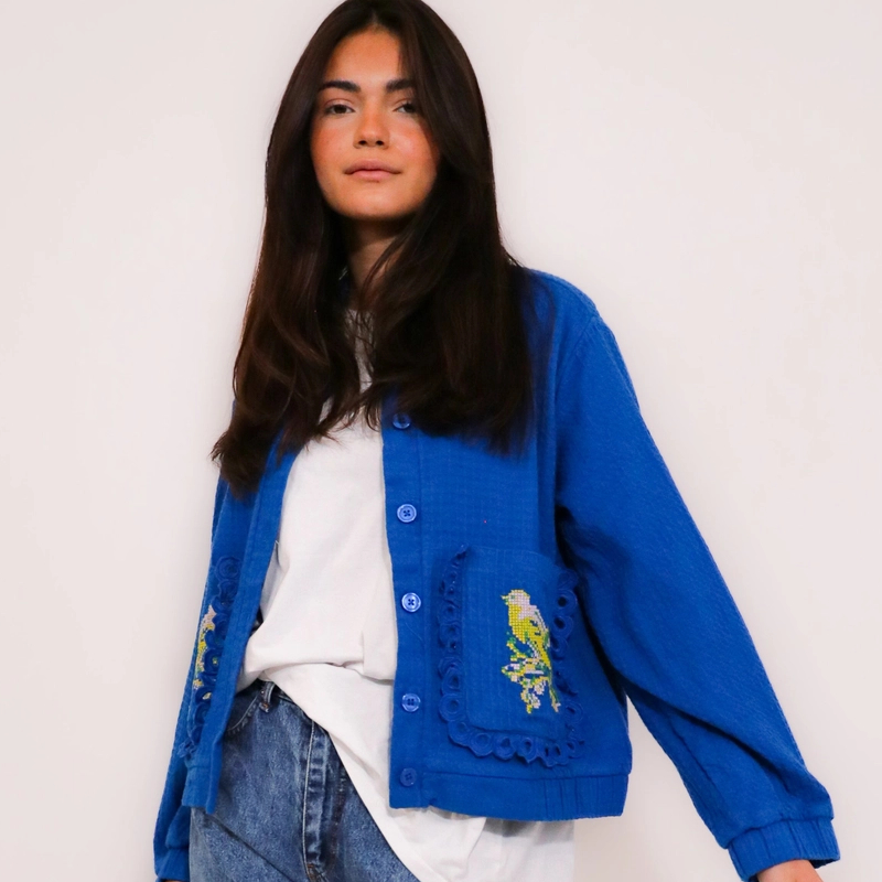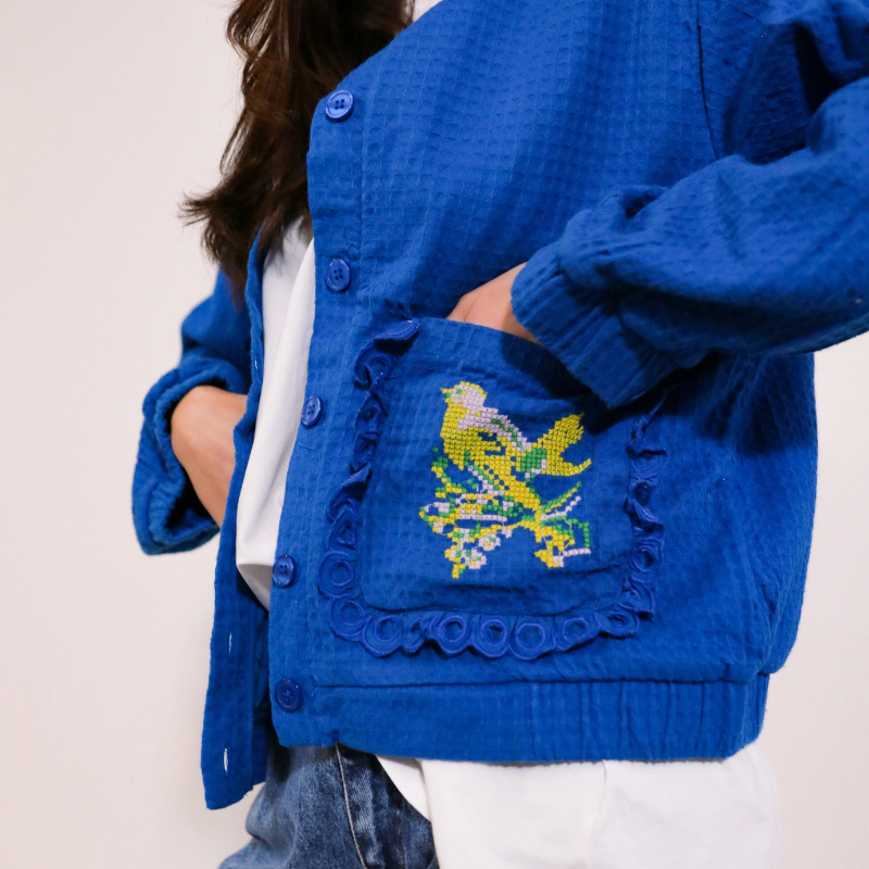 Jacke im Waffelmuster. Kreuzstichstickerei auf den Taschen und am Rücken.