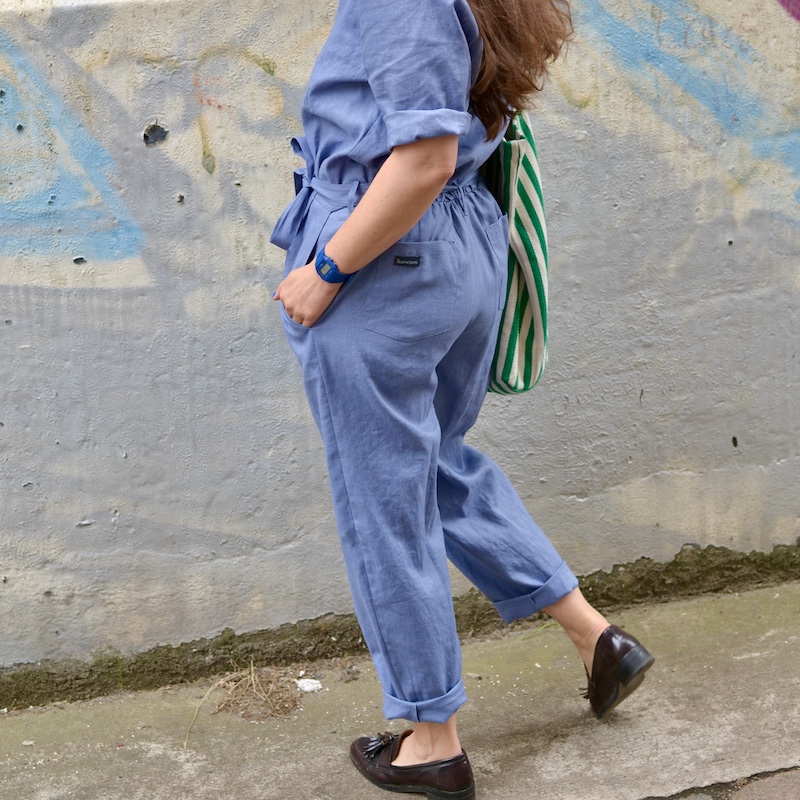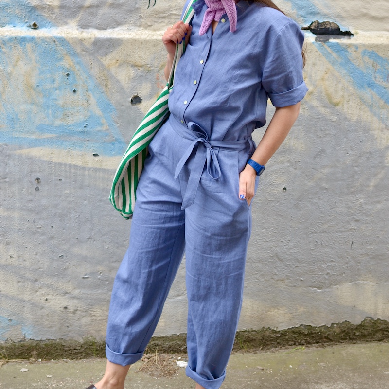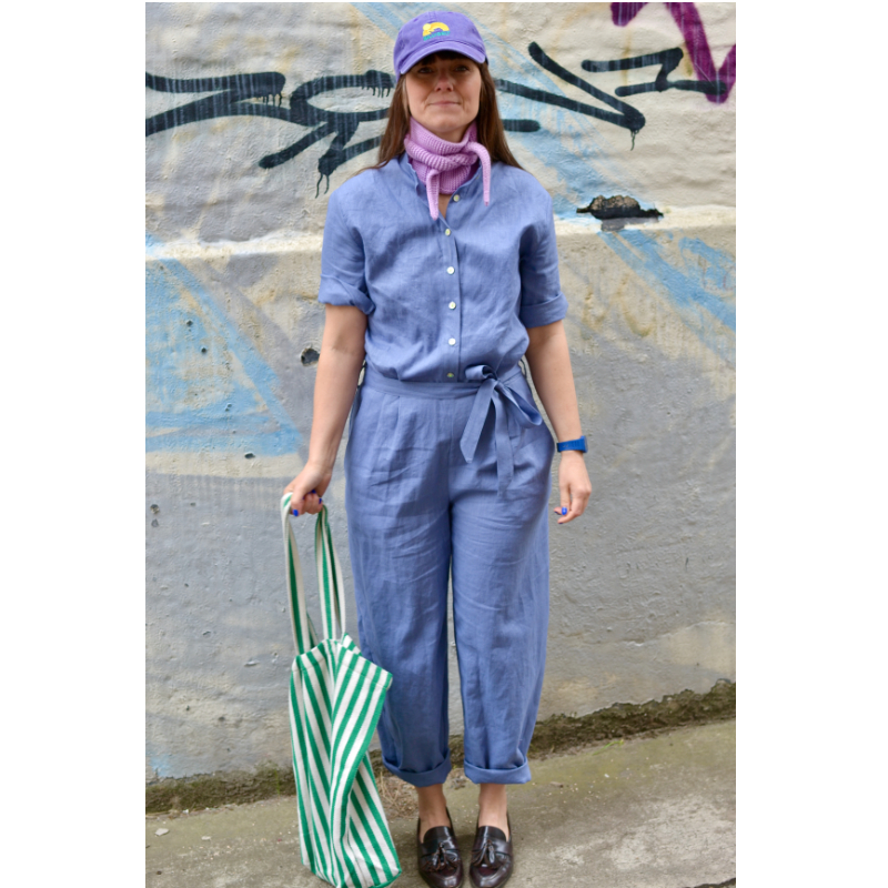 Overall aus leichtem Leinen. Er trägt sich ganz luftig, da das Material federleicht ist. Die kurzen Ärmel kann man auch aufkrempeln.