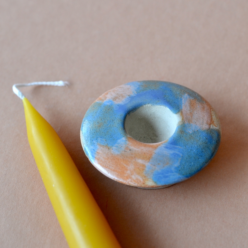 Keramikkerzenhalter aus Steingut. Er ist in Drehtechnik entstanden und mit einem Unterglasurstift bemalt.