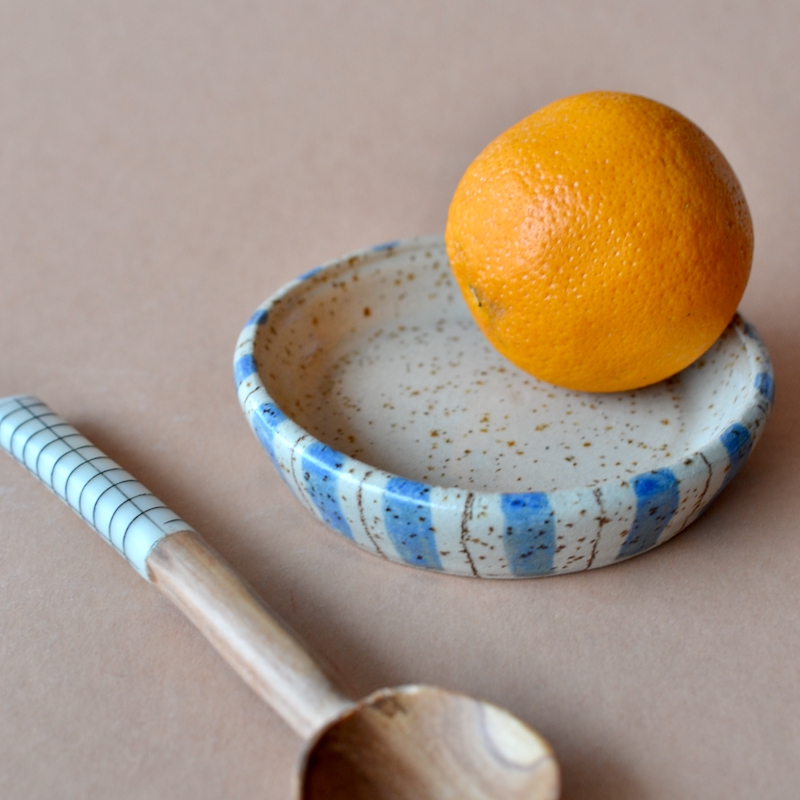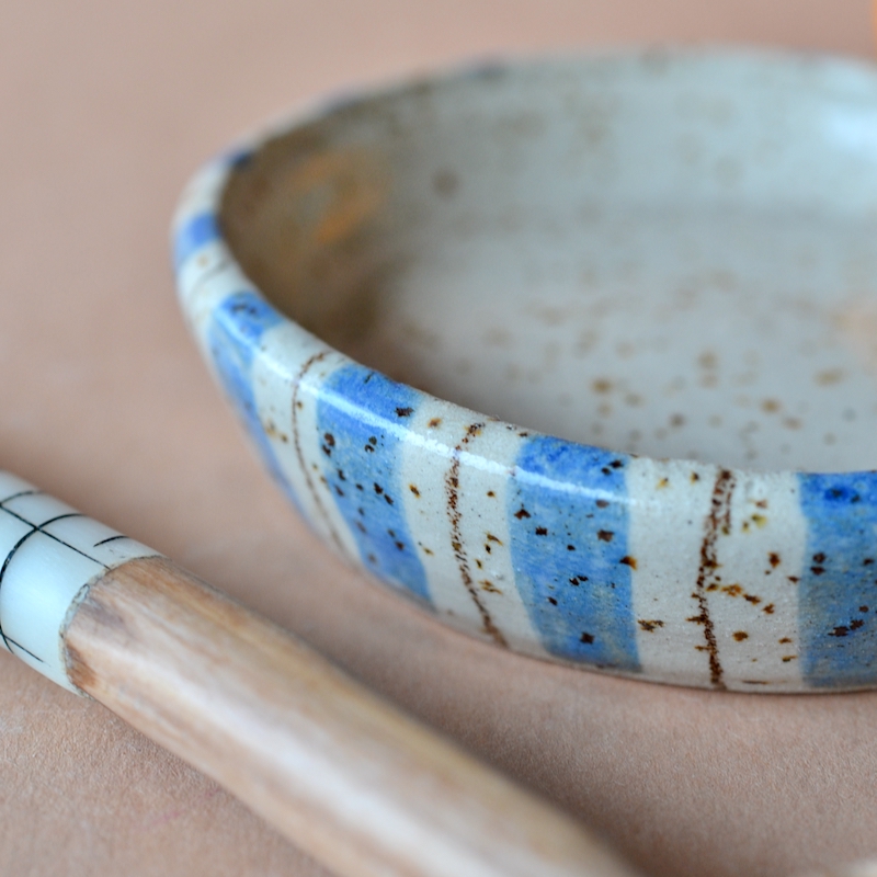 Keramikschale mit blauen und braunen Streifen. Das Schälchen ist in Drehtechnik entstanden. Es ist nicht perfekt, hat kleine Unebenheiten in Ton und Glasur und hat somit einen handgemachten Look. Ein einzigartiges Unikat eben. Du kannst es für viele Zwecke verwenden. Das verwendete Material ist Steinzeug, transparent glasiert und somit spülmaschinenfest und ganz schön robust.