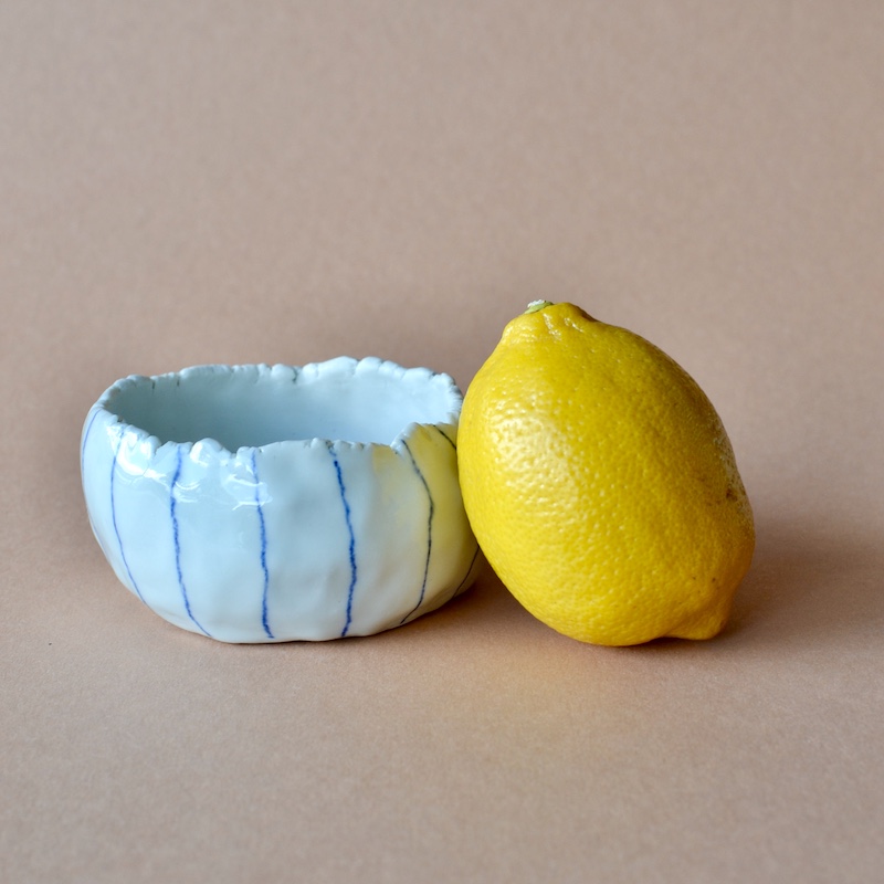 Kleines Porzellangefäss mit blauen Streifen. Das Gefäss ist in aufwendiger Daumendrücktechnik entstanden und hat somit einen handgemachten Look mit kleinen Unebenheiten in Ton und Glasur. Ein einzigartiges Unikat eben. Du kannst es für viele Zwecke verwenden. Das verwendete Material ist Porzellan, transparent glasiert und somit spülmaschinenfest und ganz schön robust.