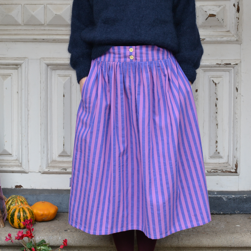 Der Rock wird vorne mit zwei bunten Knöpfen und mit einem Reißverschluss hinten geschlossen.