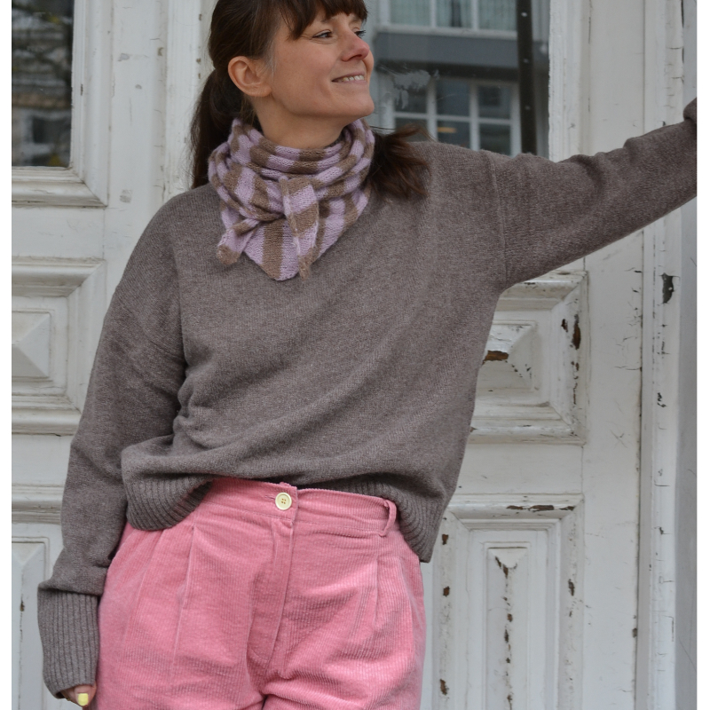 Nicki ist 170 cm groß und hat Konfektion 38/40. Leide haben wir vergessen das Halstuch mal abzunehmen. Der Pulli hat den gleichen Kragen wie die bedien anderen Wollpullis in light grey und mid grey 😉